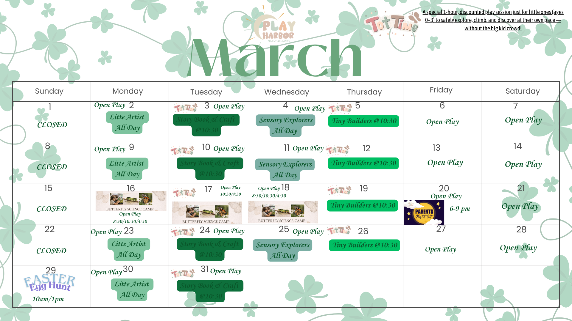 Toddlers are welcome at all play sessions, but Toddler Time is a special, shortened 1-hour session where the space is reserved exclusively for them to explore and play freely without the presence of older children